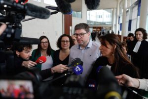 Les parents d’Evaëlle, à l’ouverture du procès contre une enseignante accusée d’avoir « dégradé les conditions de vie » de la collégienne, au tribunal de Pontoise (Val-d’Oise), le 10 mars 2025.